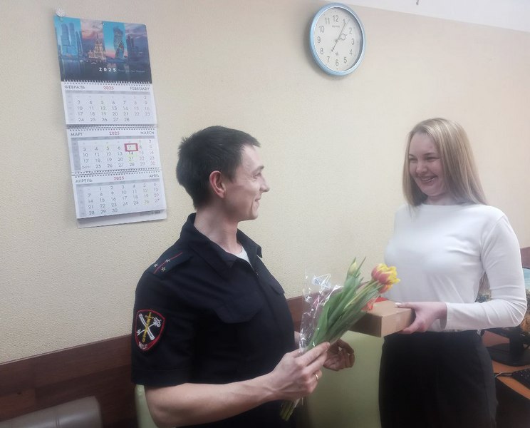 В Лысьве сотрудниками отдела внутренних дел реализуется праздничная акция «8 марта в каждый дом». Сегодня в Лысьве к акции присоединились сотрудники тыла отдела МВД России по Лысьвенскому городскому округу. Старший лейтенант полиции Александр Зиганшин по поручению руководства отдела поздравил Ольгу Сбитневу – дочь Валерия Ивановича Палкина - сотрудника, погибшего при исполнении служебных обязанностей. Важно подчеркнуть, что лейтенант полиции Ольга Валерьевна продолжает семейную династию и является сотрудником отдела по вопросам миграции ОВД. Сотрудники территориального отдела полиции поздравили Ольгу Валерьевну с наступающим весенним праздником, вручив памятные подарки и цветы.