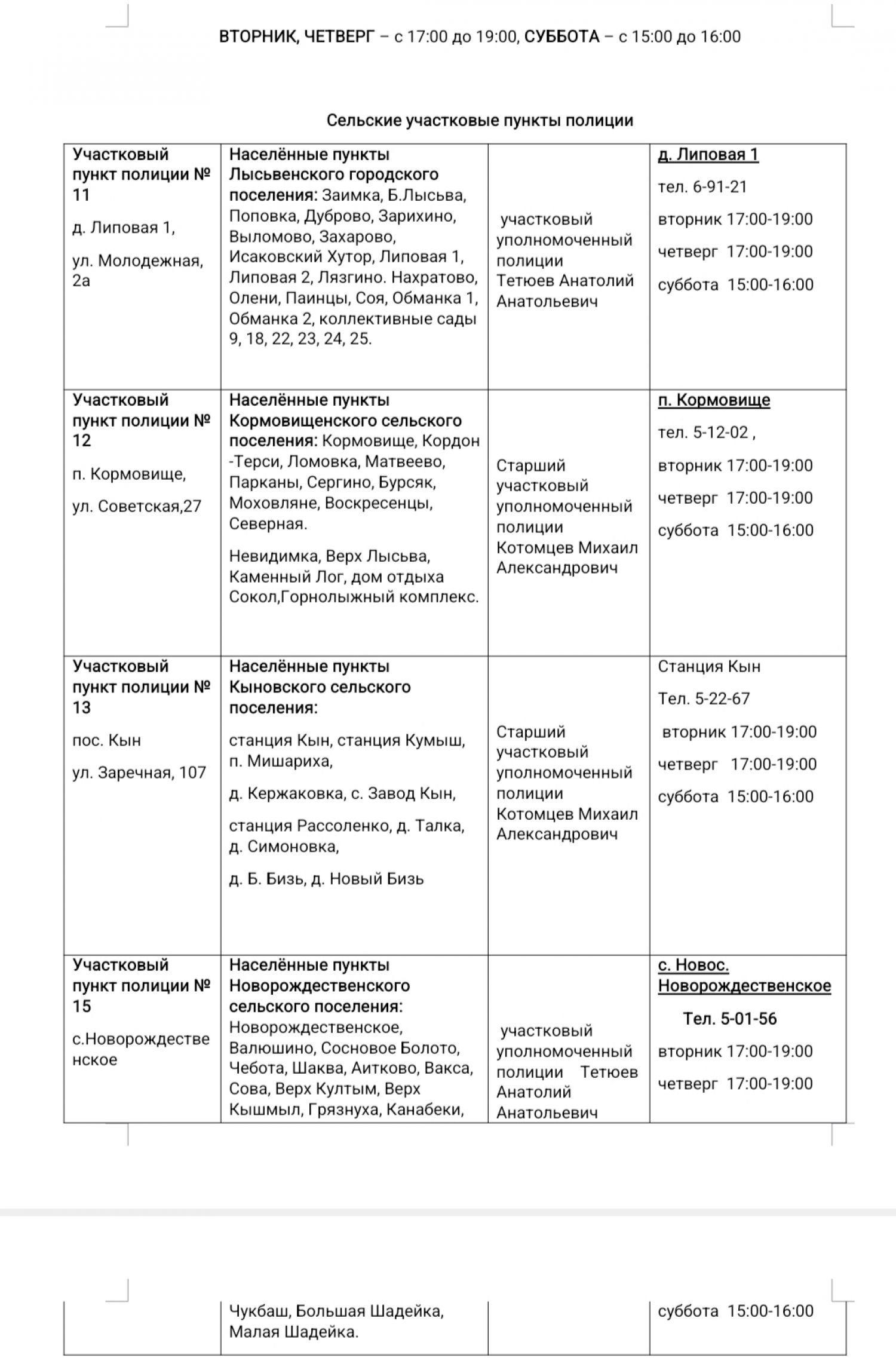 Список участковых уполномоченных полиции