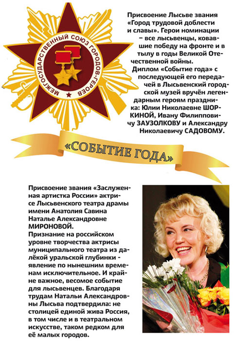 В минувшую субботу лысьвенцы аплодировали землякам, получившим звание «Человек года». Радостное настроение, поздравления, цветы, подарки, сюрпризы... Каждый, кто поднимался на сцену на торжестве, устроенном редакцией «Искры» для победителей, с волнением принимал людскую благодарность за труды во славу родного города.