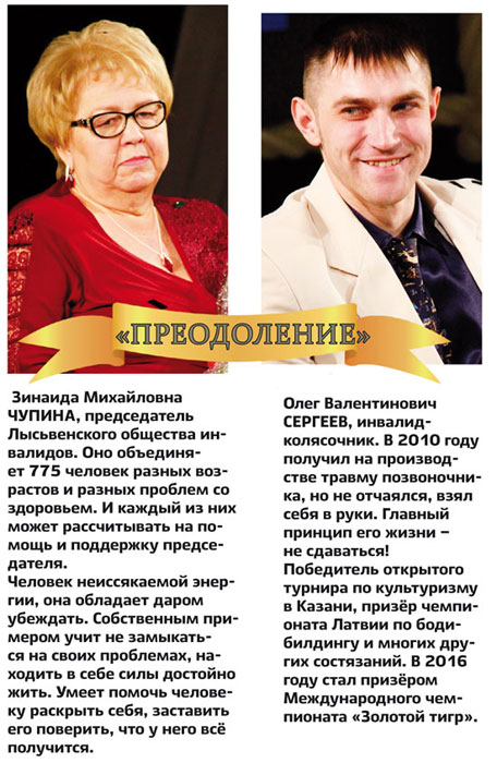 Редакция получила 472 письма о номинантах. В акции участвовали 5477 человек. Лысьвенцы назвали 80 претендентов на главное звание года! Регалии победителей получили 27 номинантов.