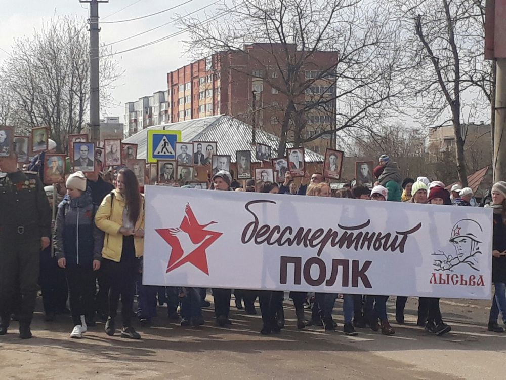 9 мая на площади перед Лысьвенским культурно-деловым центром состоялся парад, посвященный Дню Победы. Открыли мероприятия участники движения «Бессмертный полк». По площади проведения парада участники движения прошли под песни «Бессмертный полк» и «Лысьвенская каска», написанные лысьвенским поэтом Андреем Григорьевым. Перед трибунами, на которых были размещены ветераны, участниками акции были выпущены воздушные шары и голуби. По завершении шествия состоялся праздничный парад.