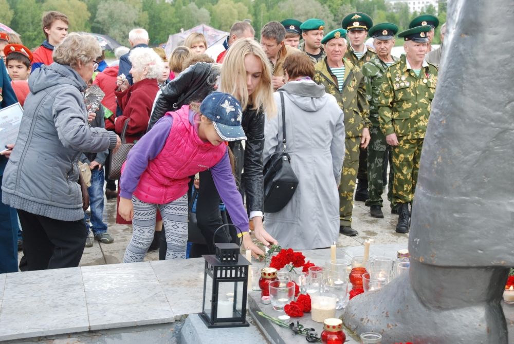 Собравшиеся почтили память земляков, погибших на фронтах Великой Отечественной войны, минутой молчания. После чего, зажженные свечи установили на постамент у скульптурной группы «Мать провожает сына на фронт».