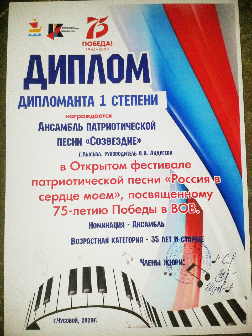 16 февраля 2020 года участниками ансамбля «Созвездие», стали дипломантами Первой степени в Открытом фестивале патриотической песни «Россия в сердце моем», который состоялся в г. Чусовом. Руководит работой ансамбля талантливый музыкант Ольга Андреева. В состав коллектива входят ветераны отдела внутренних дел Лысьвы и представители казачества. На фестивале коллектив представил «Песню о Матери планете», которую многие помнят в исполнении Муслима Магомаева.