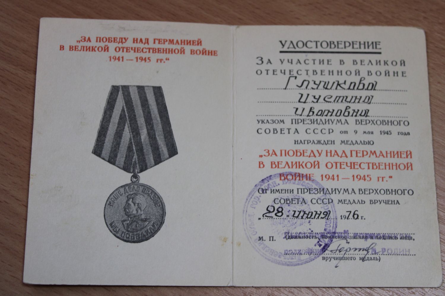 В нашем семейном архиве сохранилась уникальная фотография, датированная 8 июня 1941 года, на ней выпускной класс школы № 3, и среди них моя бабушка – Иустина Ивановна Глушкова. Смотришь на фото, и понимаешь, что через несколько дней начнется война, и 22 июня 1941 года перечеркнет все мечты этих вчерашних девчонок и мальчишек, и в их судьбе появится страшное слово – война…