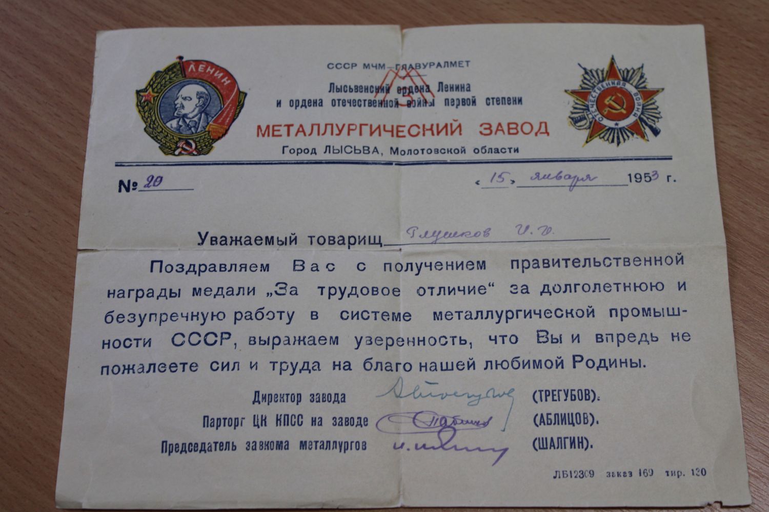 Хочу сегодня несколько слов сказать о своих дедушке и бабушке. Они были тружениками тыла, во время войны трудились на металлургическом заводе, без сна и отдыха ковали вместе со своими товарищами Победу в Лысьве.
