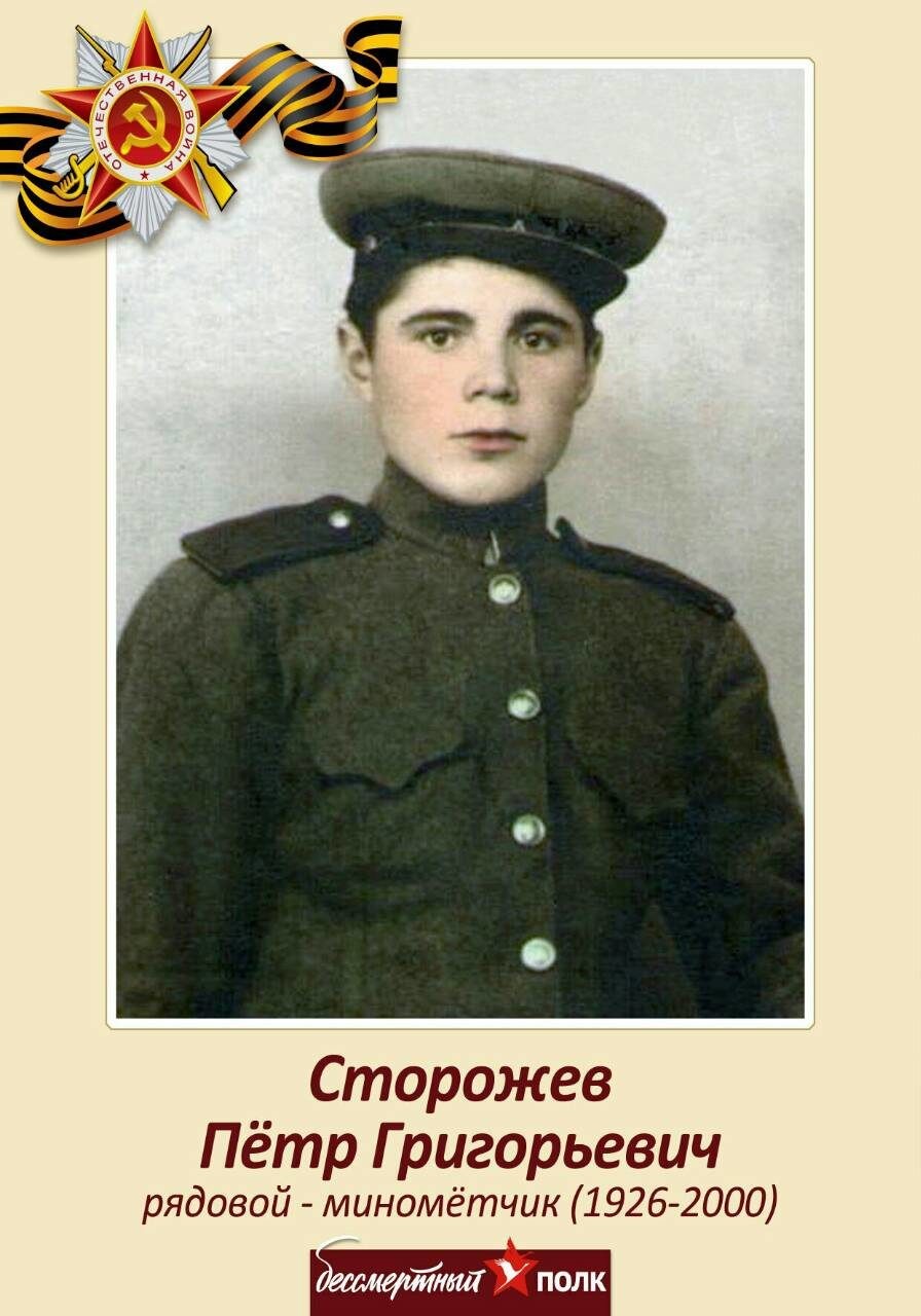 Сторожев Петр Григорьевич родился 10 октября 1926 года в селе Покровка, Северо-Казахстанской области. Закончив 8 классов, начал работать в местной школе физруком. Война началась, когда Петру было 14, в возрасте 18 лет, в 1944 году, молодой, чубастый Перт Сторожев, уходит добровольцем на фронт, защищать Родину, односельчан, свою семью.