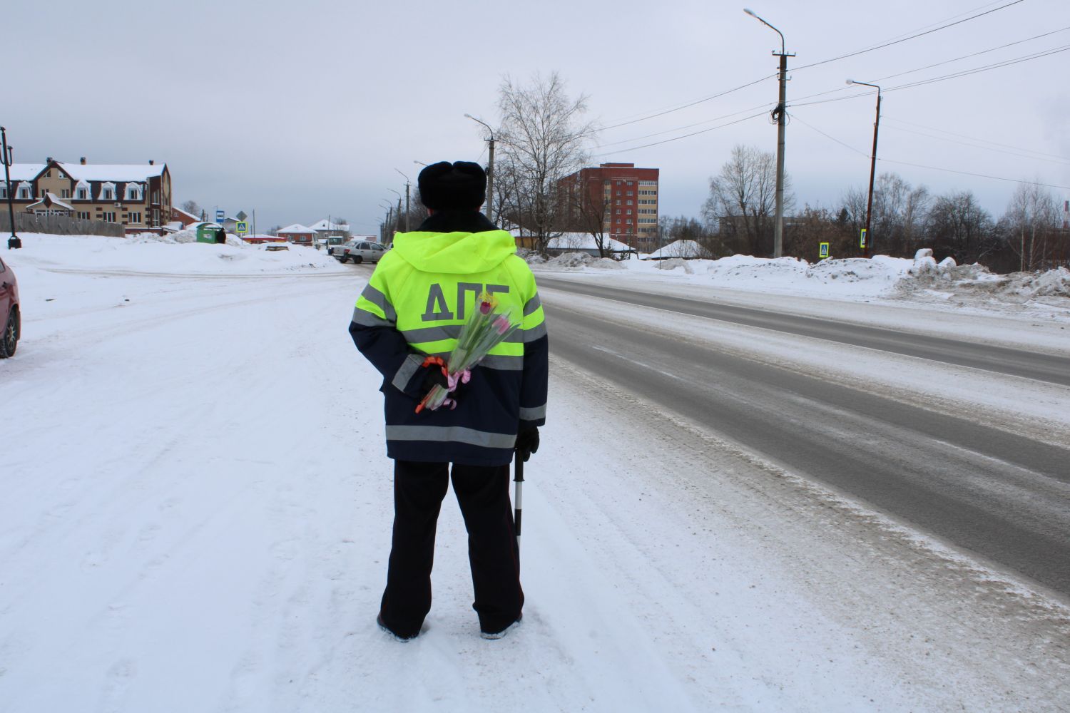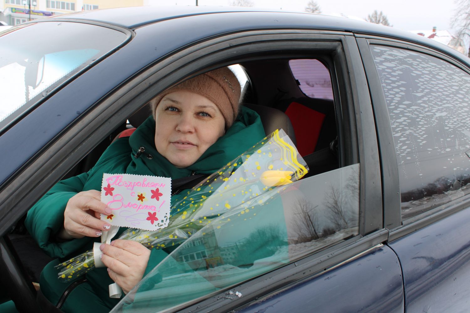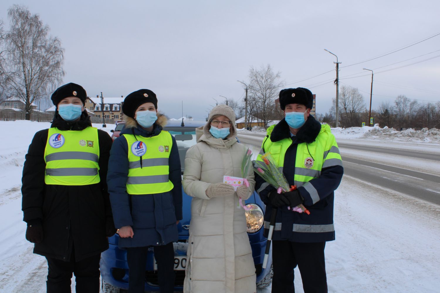 В преддверии Международного женского дня стражи правопорядка и общественники поздравляют милых женщин с праздником, и вручают участницам дорожного движения, находящимся за рулём своих авто, первые весенние цветы – разноцветные, яркие тюльпаны.