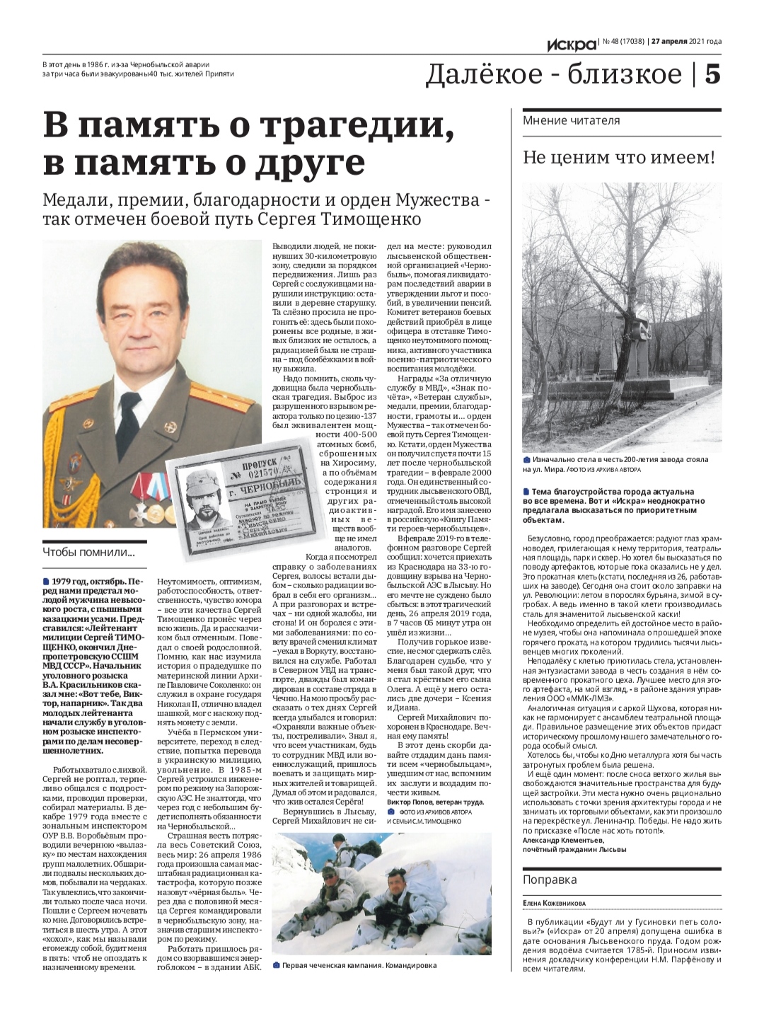 - Масштаб катастрофы мог стать намного больше, если бы не проявленное мужество и героизм людей разных профессий - работников самой станции, пожарных, военнослужащих, сотрудников милиции, представителей научной и медицинской сфер - рассказал Алексей Николаевич. Каждый год мы вспоминаем тех, кто ценою собственных жизней и здоровья боролся с последствиями страшной аварии. Хочу выразить благодарность главному редактору газеты «Искра» Ирине Кетовой и коллективу редакции газеты, а также автору статьи Виктору Попову, ветерану труда, за опубликование материала о сотруднике отдела внутренних дел Лысьвы Сергее Тимощенко, к памятной дате.