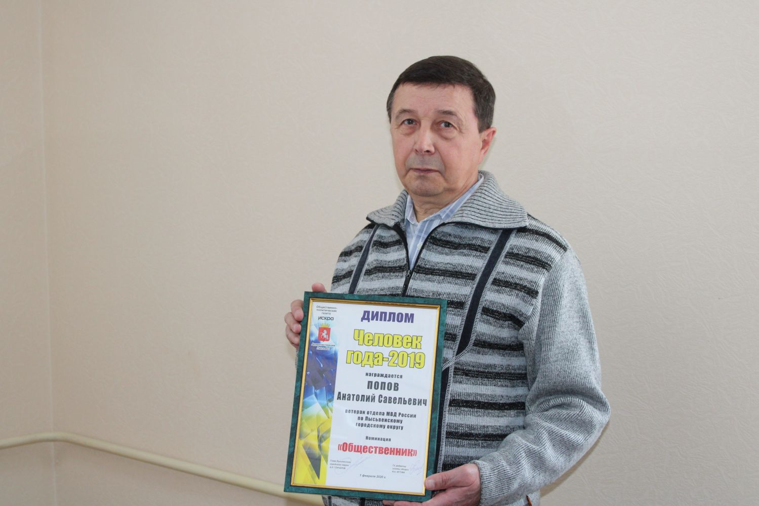 2019-й стал для Анатолия Савельевича богатым на события. Решением совета ветеранов отдела МВД России по Лысьвенскому городскому округу от его имя занесено в Книгу Почёта сотрудников и ветеранов ОВД, а по итогам общественной работы Анатолий Попов стал победителем в номинации «Общественник» народной акции «Человек года-2019».