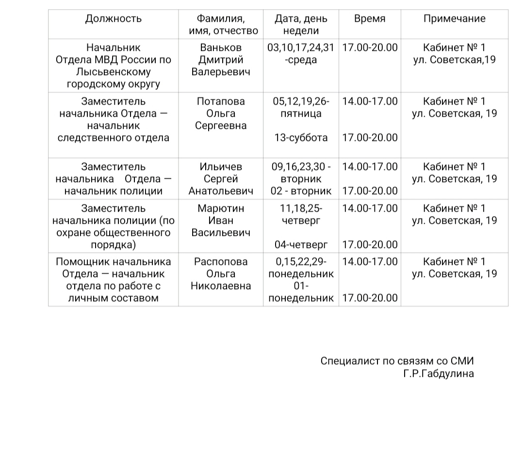 Уважаемые жители Лысьвенского городского округа, информируем вас о графике приема граждан руководящим составом отдела МВД России по Лысьвенскому городскому округу на август 2022 года.