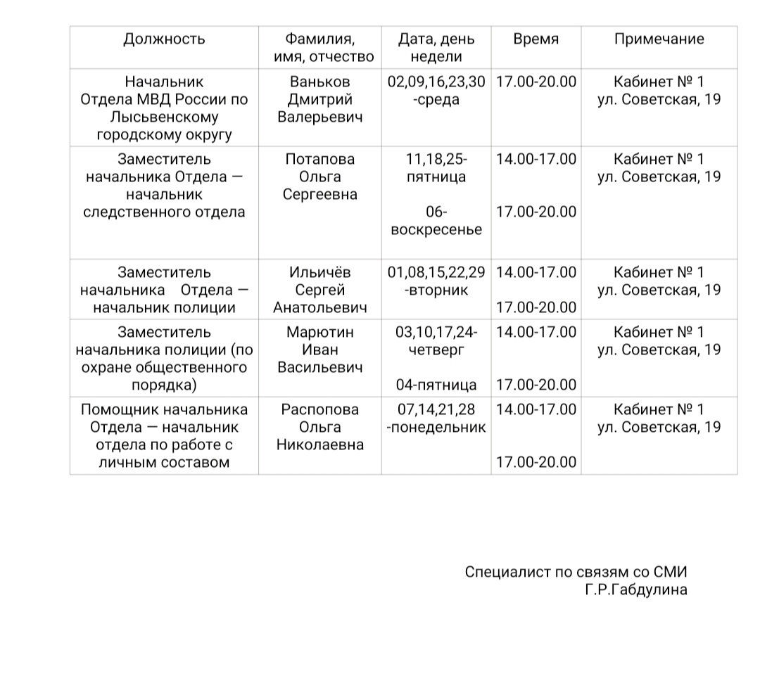 Уважаемые жители Лысьвенского городского округа, информируем вас о графике приема руководящим составом отдела МВД России по Лысьвенскому городскому округу в ноябре 2022 года. Обращаем внимание граждан, что возможна предварительная запись по телефону 8 (34 249) 6-01-40. При отсутствии руководителя, прием осуществляет лицо, исполняющее обязанности.