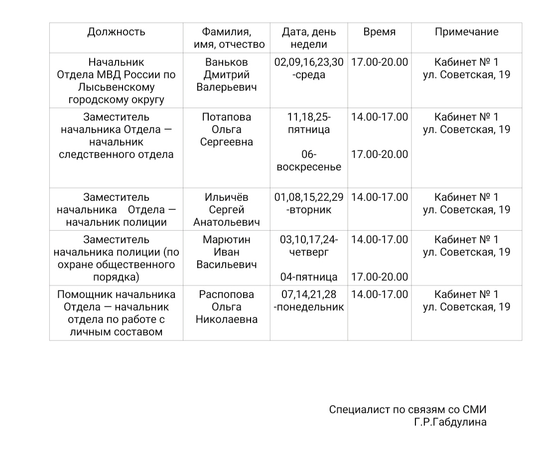 Уважаемые жители Лысьвенского городского округа, информируем вас о графике приема руководящим составом отдела МВД России по Лысьвенскому городскому округу в ноябре 2022 года. Обращаем внимание граждан, что возможна предварительная запись по телефону 8 (34 249) 6-01-40. При отсутствии руководителя, прием осуществляет лицо, исполняющее обязанности.