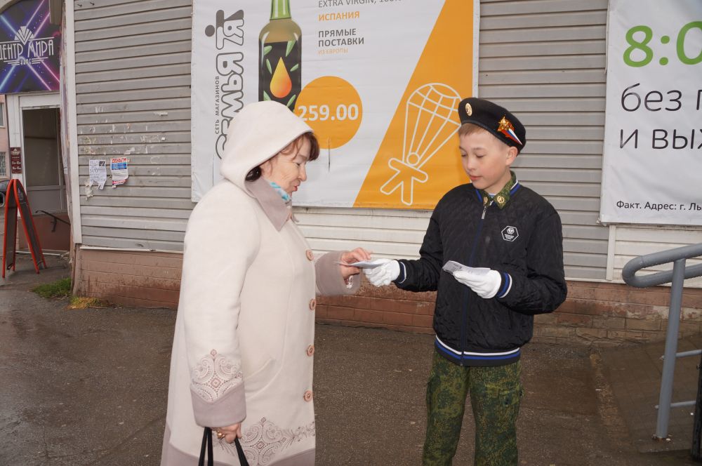 Сегодня к акции присоединились юные кадеты одной из школ города и отряд волонтеров Лысьвенского политехнического колледжа. Акция стартовала в центральном районе города, с привлечением представителей средств массовой информации - двух телекомпаний и печатных изданий. Затем ребята продолжили реализацию акции в районах города по месту расположения их учебных заведений.