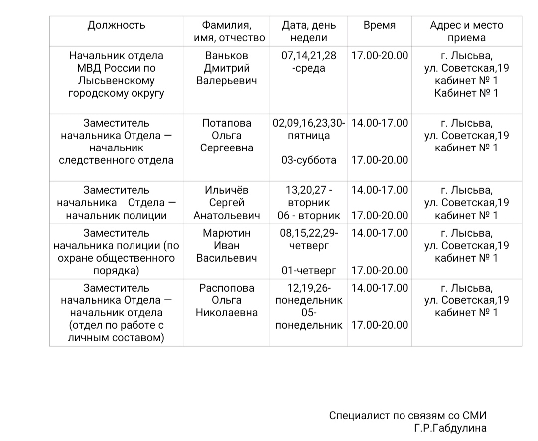 Информация о графике приема граждан руководящим составом отдела МВД России по Лысьвенскому городскому округу в декабре 2022 года