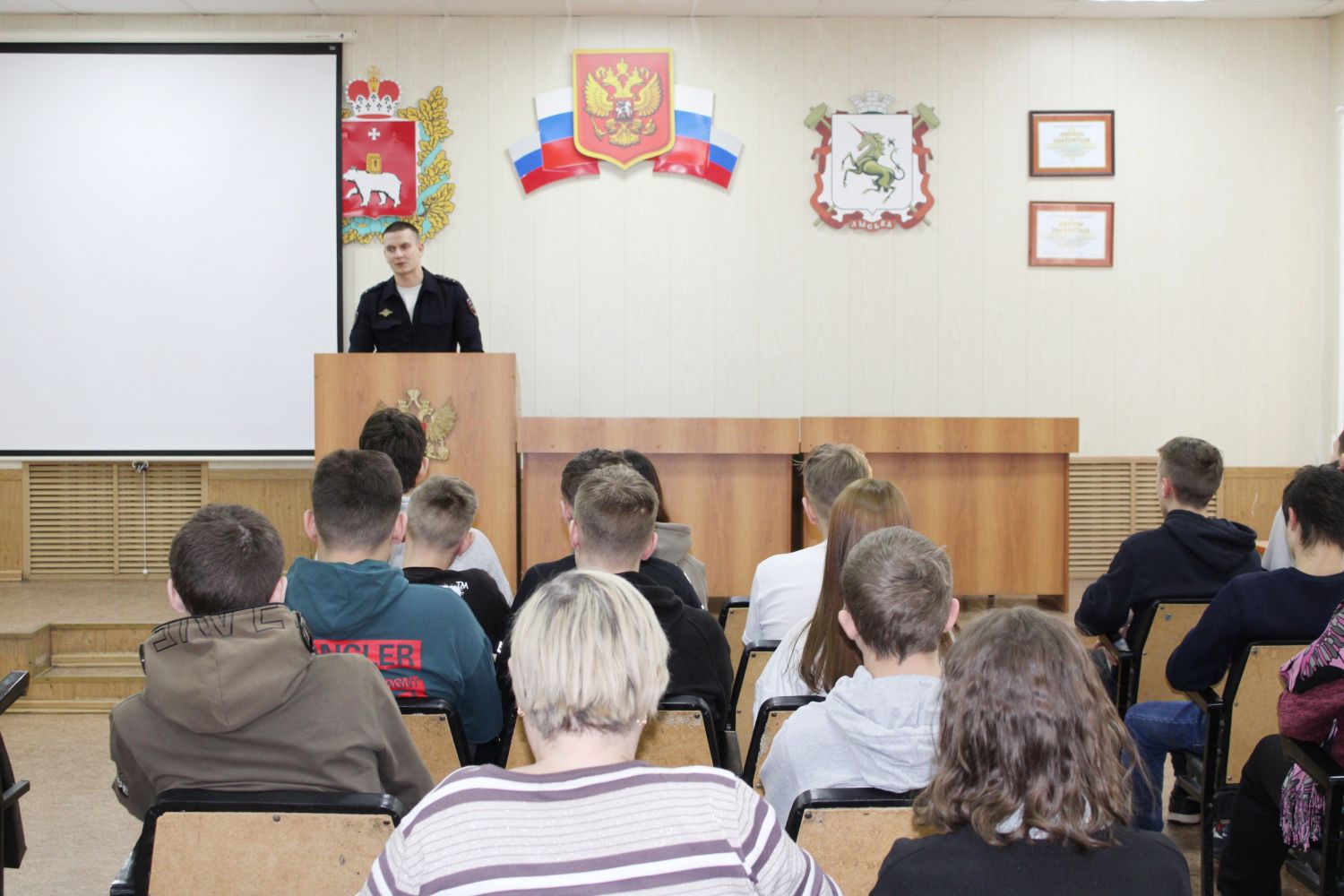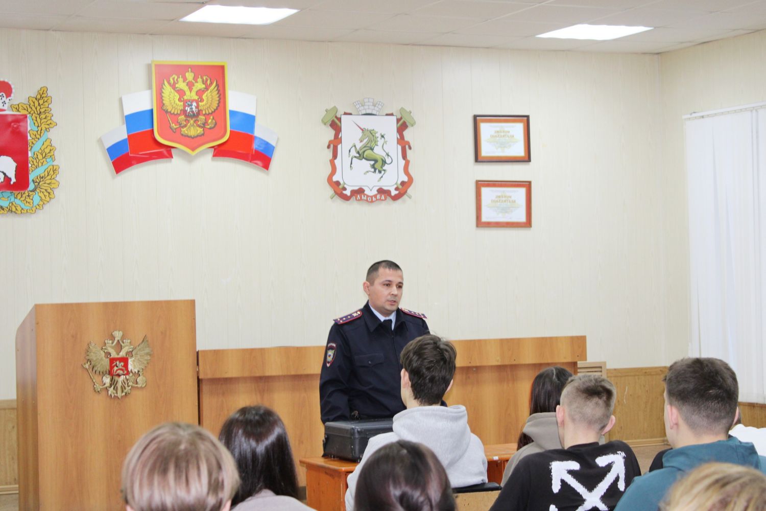 В рамках акции «Студенческий десант» в зале для совещаний территориального отдела полиции Лысьвы по приглашению полицейских собрались студенты образовательных учреждений среднего профессионального образования города. Студенты трех образовательных учреждений СПО вместе с педагогами стали участниками информационно - профилактического мероприятия «Закон и порядок в молодежной среде». Девушек и юношей приветствовали начальник отдела по работе с личным составом ОМВД России по Лысьвенскому городскому округу, подполковник полиции Ольга Распопова и председатель Общественного совета Андрей Батуев.