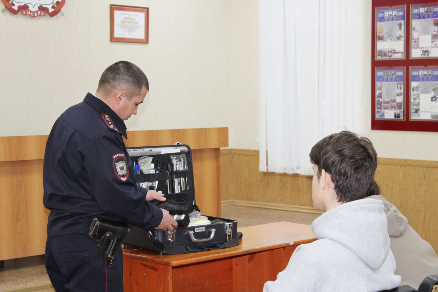 Завершилось мероприятие выступлением эксперта – криминалиста. Пристальное внимание гостей было приковано к чемодану. Капитан полиции Денис Мазитов показал его содержимое и рассказал, чем пользуются чаще всего из его содержимого на месте происшествия сотрудники ЭКО. Студенты узнали о проводимых в полиции видах экспертиз, о составлении фотороботов, изъятии различных следов с места происшествия, о тонкостях изготовления слепков.
