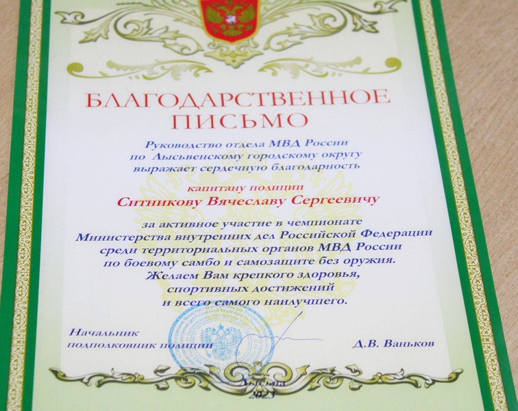 Руководство отдела МВД России по Лысьвенскому городскому округу отметило Вячеслава Ситникова благодарственным письмом за успехи в спорте, пожелав новых побед во взятии спортивных вершин.