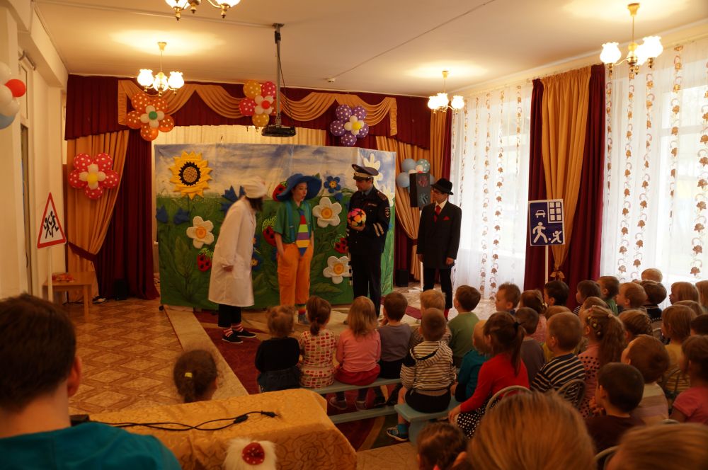В закрепление полученных знаний детьми в профилактической беседе с полицейскими, актеры театра наглядно разыгрывают жизненные ситуации на сценической площадке. Веселый Незнайка, умный Пилюлькин помогают детям решать дорожные задачки.