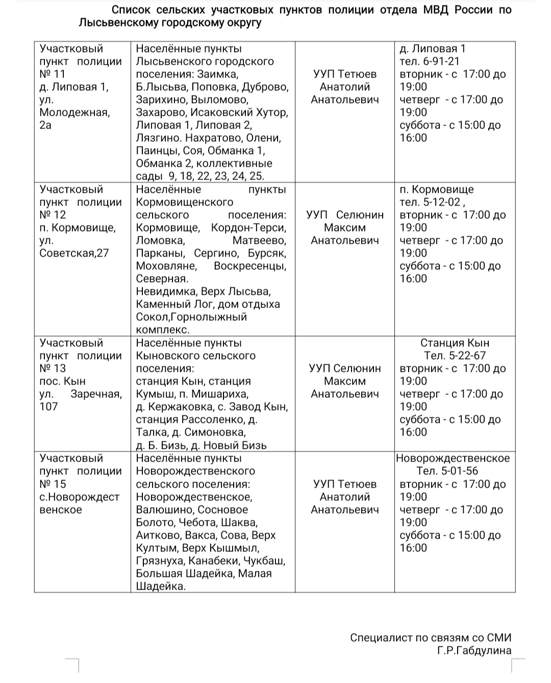 Список сельских участковых пунктов полиции отдела МВД России по Лысьвенскому городскому округу