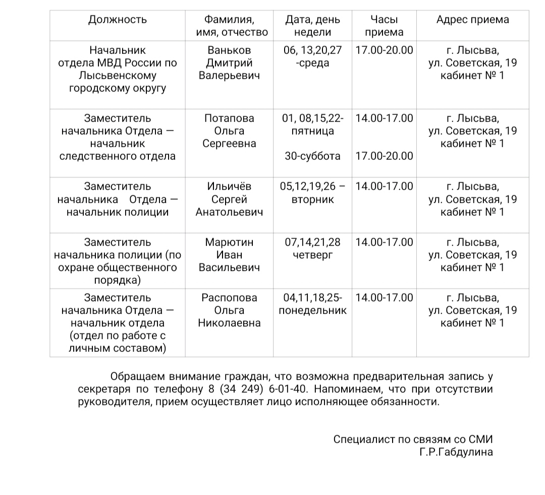 Уважаемые жители Лысьвенского городского округа, информируем вас о графике приема руководящим составом отдела МВД России по Лысьвенскому городскому округу в сентябре 2023 года.