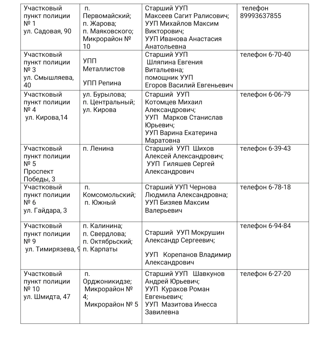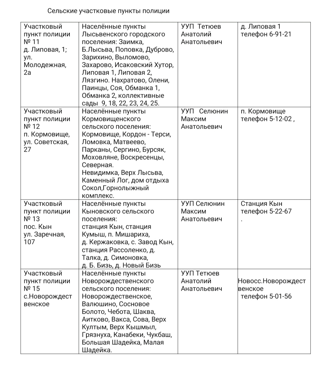 Список участковых уполномоченных полиции отдела УУП и ПДН ОМВД России по Лысьвенскому городскому округу