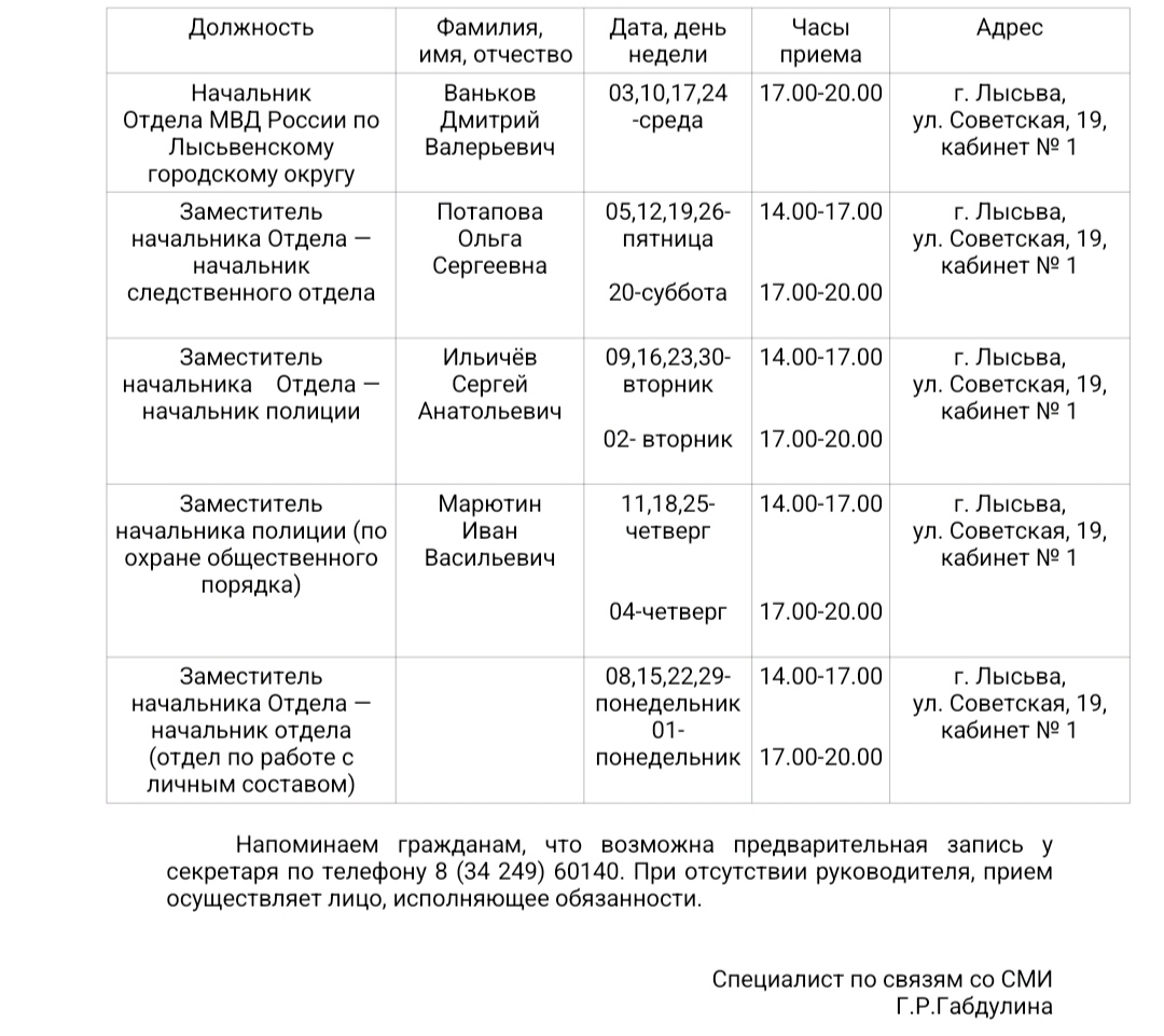 Информация о графике приема граждан руководящим составом отдела МВД России по Лысьвенскому городскому округу в апреле 2024 года