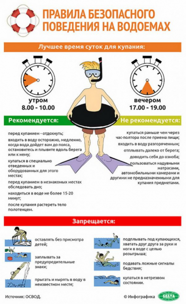 Во избежание перегревания отдыхайте на пляже в головном уборе. Не допускайте ситуаций неоправданного риска, шалости на воде. На воде категорически запрещены игры, во время которых нужно захватывать и топить других. Не пытайся плавать на бревнах, досках, самодельных плотах.