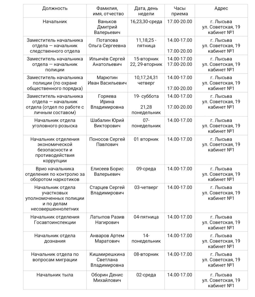 Информация о графике приема граждан руководящим составом отдела МВД России по Лысьвенскому городскому округу в октябре 2024 года