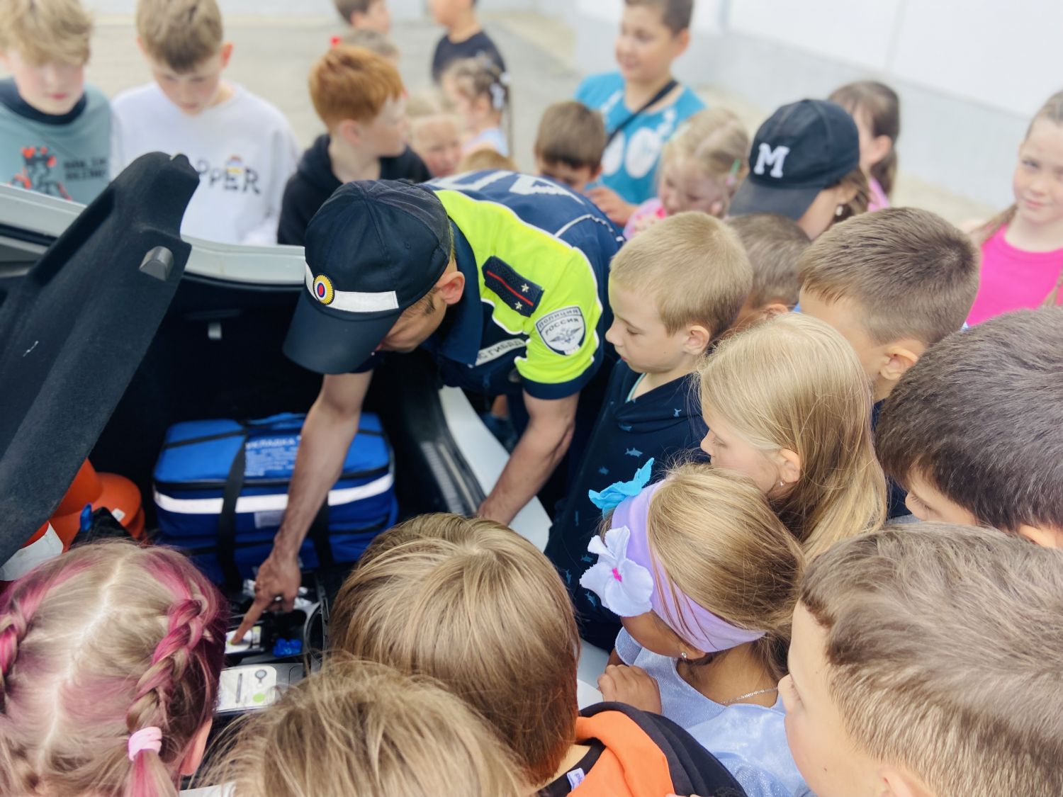 Сотрудники Госавтоинспекции повторили с ребятами правила дорожного движения для пешеходов и велосипедистов, особое внимание уделив «летним» средствам передвижения: велосипеды, самокаты, ролики, электросамокаты, моноколёса, а также рассказали о службе сотрудников ДПС, и продемонстрировали служебный автомобиль.