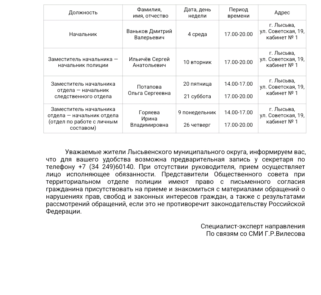 Информация для жителей Лысьвенского муниципального округа о графике приема граждан руководящим составом Отдела МВД России «Лысьвенский» в феврале 2026 года