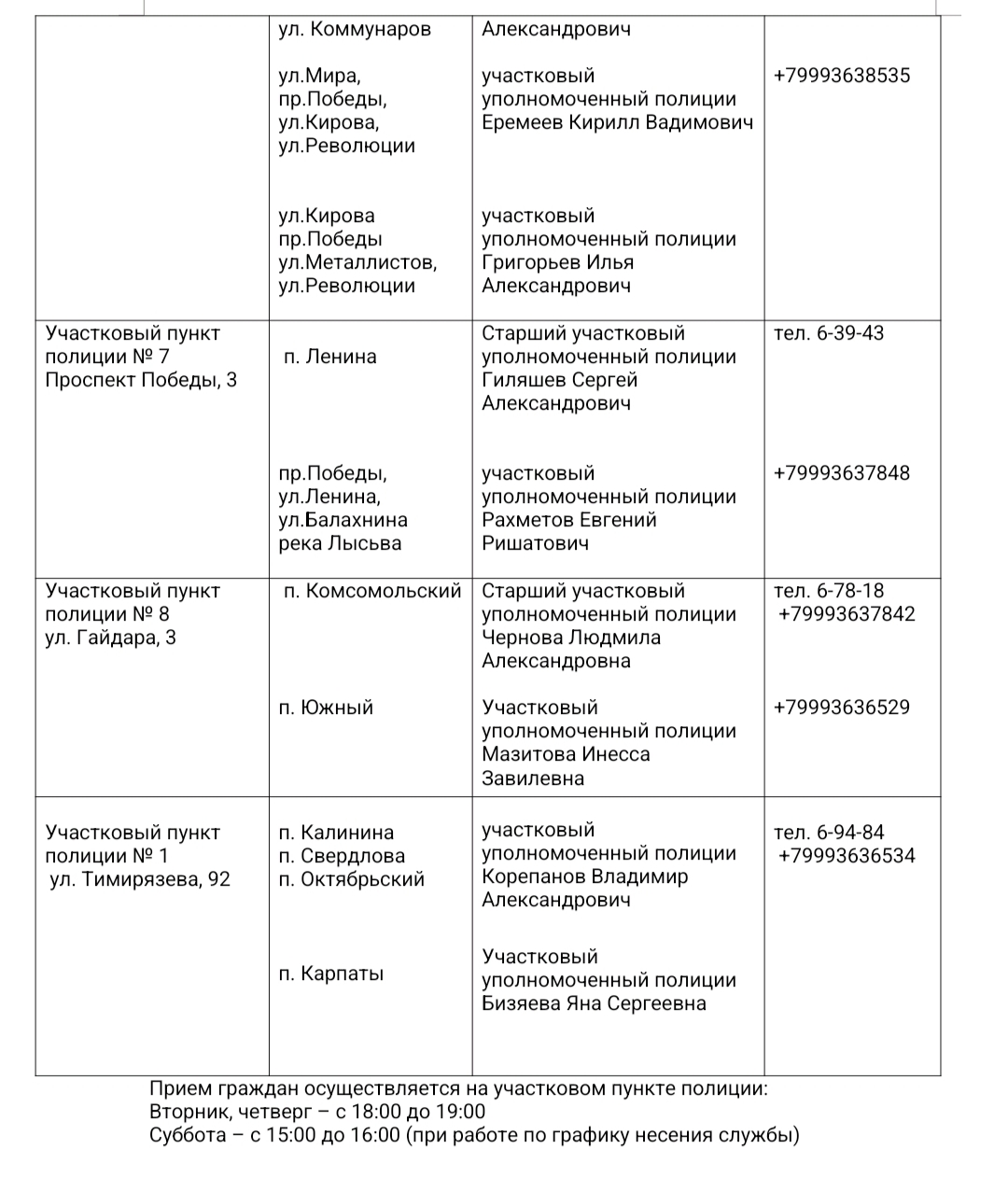 Телефоны отдела МВД