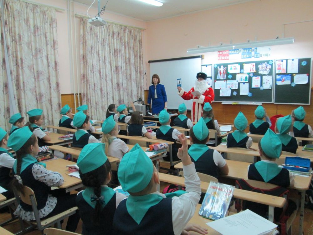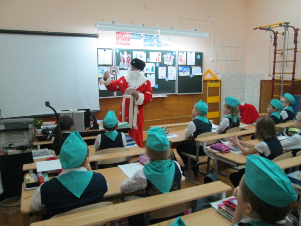 В ходе КВН полицейский Дед Мороз напомнил школьникам о необходимости использования световозвращающих элементов в темное время суток, о правилах поведения в общественном транспорте и на проезжей части.