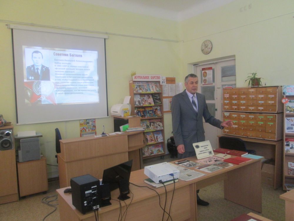 Специалисты Лысьвенской библиотечной системы при участии председателя Общественного совета Андрея Батуева 21 февраля встретились с учащимися одной из школ города на мероприятии, приуроченном к 30-летней годовщине вывода войск из Афганистана. Ежегодно в России 15 февраля вспоминают тех, кто выполнял свой служебный и воинский долг в Афганистане.