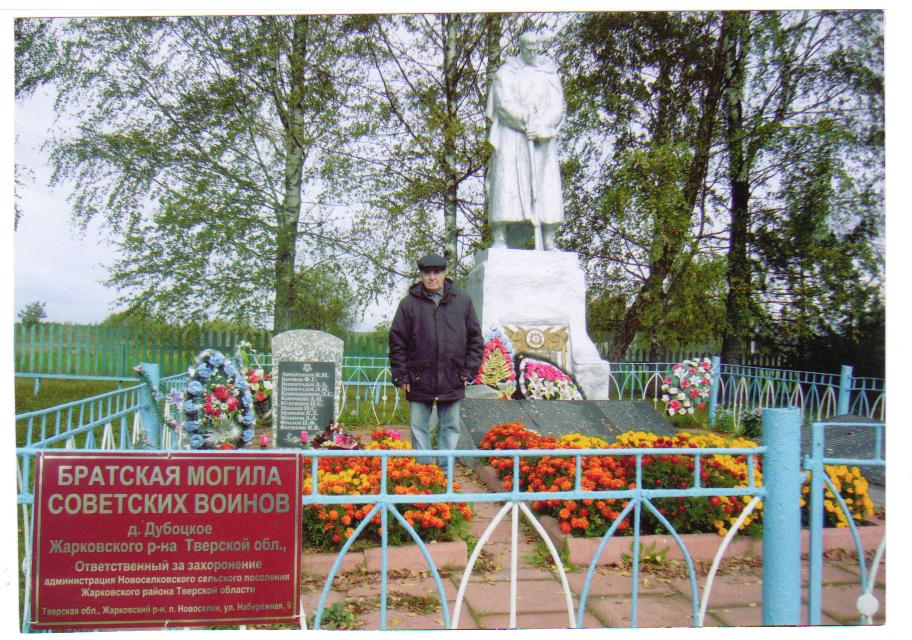 Возникали моменты, когда я чуть было уже не отчаялся, но 2016 год стал результативным. В январе 2016 года мне удалось побывать в военкомате города Смоленск, где я узнал о том, что в 1944 году территория Ильинского района была передана в Тверскую область. К радости, оказалось, что деревня Дубоцкое до сих пор существует в Жарковском районе Тверской области. Но вдруг опять неприятная новость – фамилии отца на Стелле, установленной на братской могиле в указанной деревне, не было вписано. Но руки я не опустил…