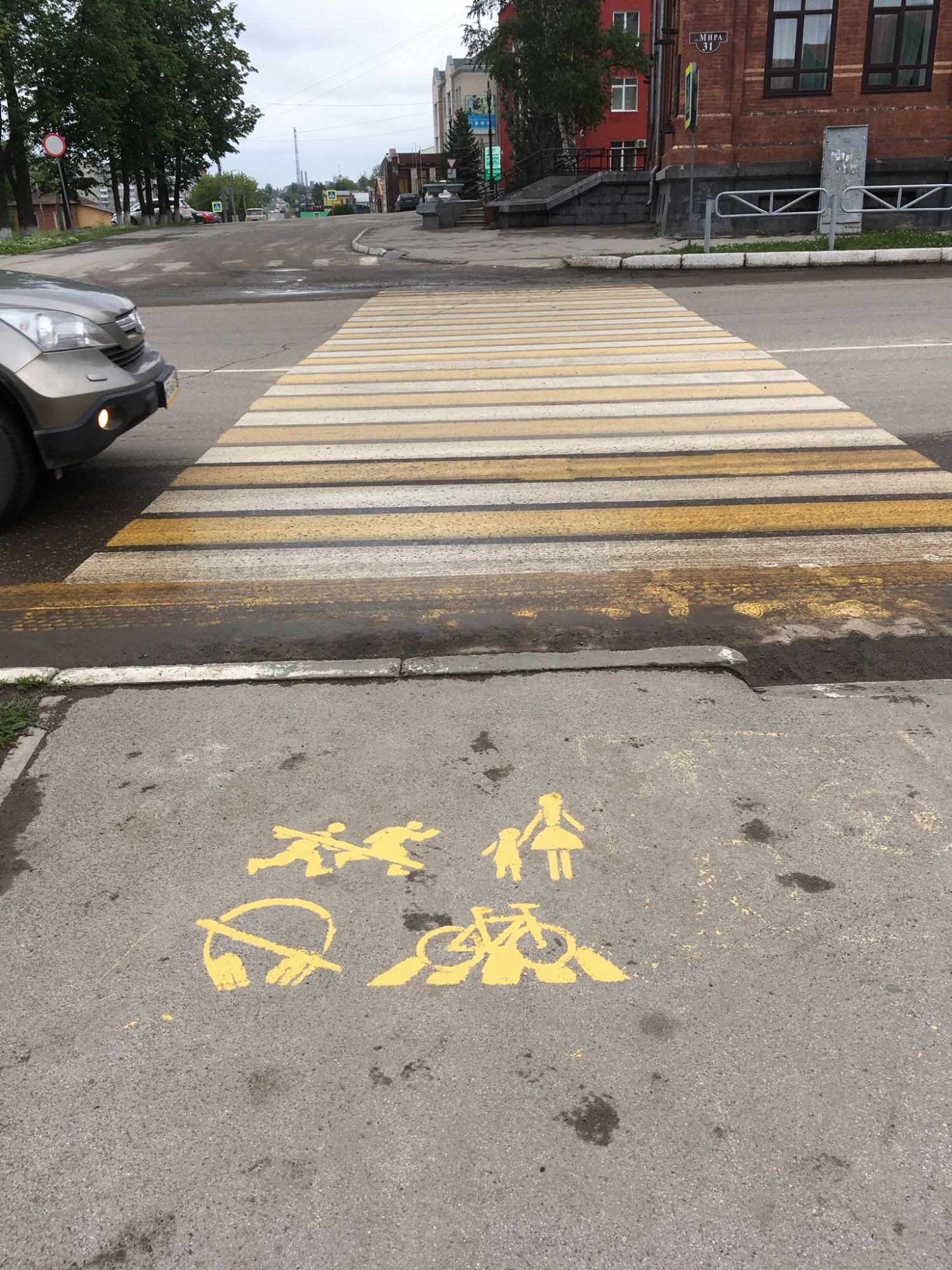 3 июля, в свой профессиональный праздник, автоинспекторы и ребята из "Подростково-молодежного центра", проанализировали ситуации и проблемы, наиболее часто возникающие у пешеходов при переходе проезжей части дороги и перед пешеходными переходами наиболее оживленной улицы города с помощью трафарета и краски нанесли на асфальт знаки говорящие о том, что перед переходом проезжей части дороги – «Возьми ребенка за руку!», «Сними наушники!», «Не выбегай на переход!», «Не выезжай на переход, управляя велосипедом!».