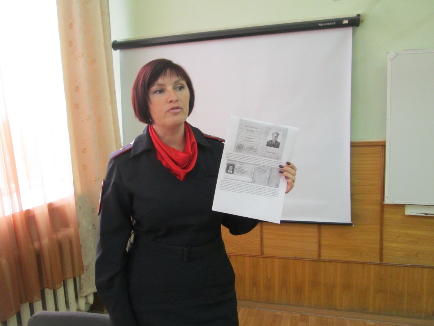 В ходе встречи полицейские рассказали учащимся о возникновении паспорта в России, как документа, удостоверяющего личность. В России внутренний паспорт был введен указом Петра I, в 1719 году. Его выдавали мужчинам, отправляющимся на заработки в город из нечерноземных губерний, официально они назывались адресными билетами, пропускными письмами и позже видами на жительство.