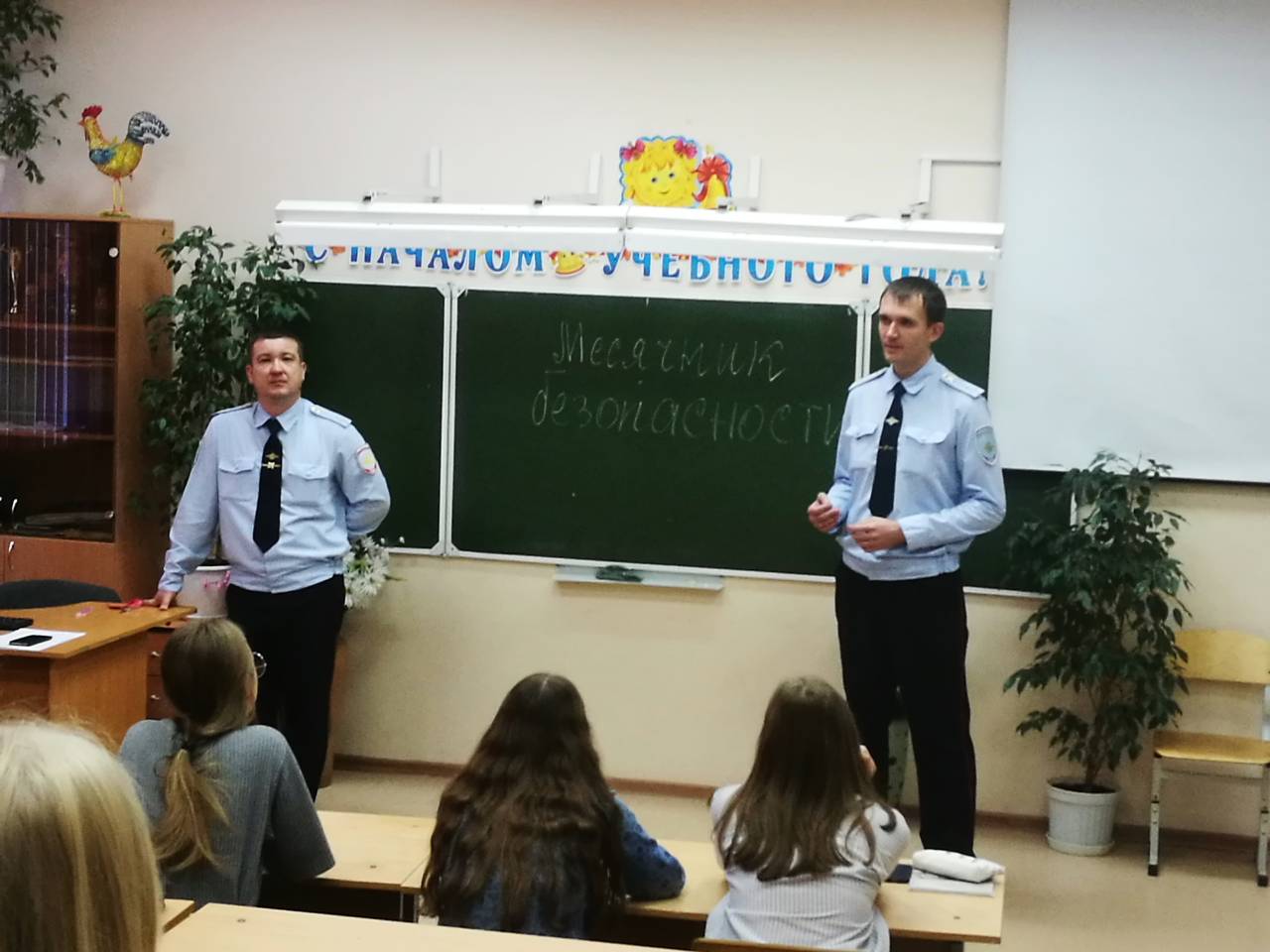 Инспектор по пропаганде безопасности дорожного движения, старший лейтенант полиции Александр Иутин доводит до школьников информацию о состоянии безопасности дорожного движения в нашем городе, о мерах по предупреждению ДТП, об изменениях в Правилах дорожного движения и штрафных санкциях. В частности, он сообщает, что на территории Лысьвенского городского округа за 8 месяцев текущего года зарегистрировано 10 ДТП с участием детей, в возрасте до 16 лет. Инспектор отмечает, что большинство ДТП происходит по вине водителей транспортных средств.